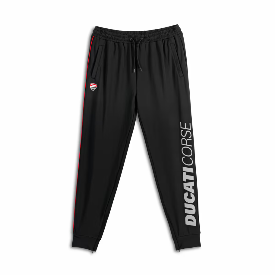 Exclusive Ducati Corse fitness pants, with drawstring waist, two outside pockets, and zippered back pocket. With its eye-catching original red detailing along the right leg, and the reflective print on the left, this comfortable garment is ideal for wintertime athletic activities. The look is completed by the rubberized print depicting the Ducati Corse shield. A sporty yet stylish garment that’s designed to convey a passion for motorcycle racing, even at the gym.